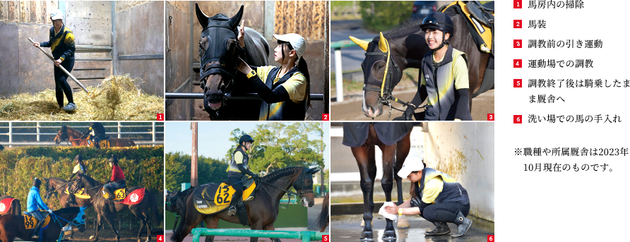 担当馬の馬房掃除や馬の手入れ、あとは調教もやらせていただいていますし、担当馬2頭のことに関しては、自分が全部やっています。